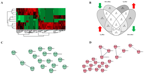 Proteomic profile of HaCaT cells exposed to high-irradiance blue or red light. High-irradiance blue or red light altered the proteome of the HaCaT cells compared with the control cells as shown using hierarchical heat map clusters (A). The Venn diagram shows that there were 31, 25, 62 and 36 proteins expressed only in “Up Blue”, “Down Blue”, “Up Red” and “Down Red”, respectively. A total of 16 common proteins were expressed in both “Down Blue” and “Down Red”; 21 common proteins were identified as upregulated after exposure to high-irradiance blue or red light. (B). A STRING analysis reported by Cytoscape revealed the correlations between proteins commonly downregulated (C) and/or upregulated (D) in HaCaT cells exposed to blue or red light.