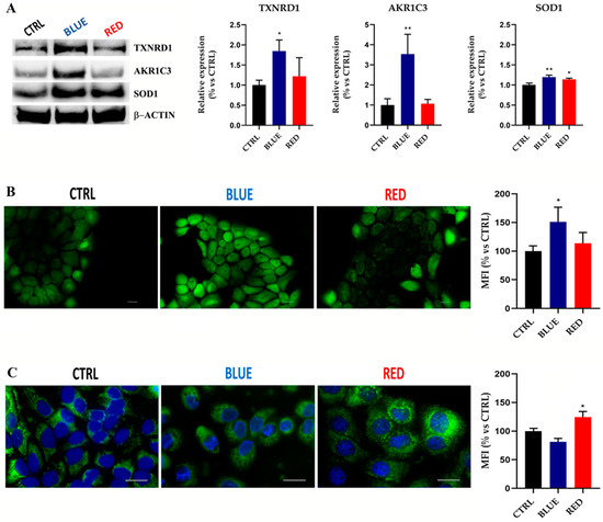 Western blot analysis was used to confirm the proteomic profiling results obtained from the HaCaT cells exposed to high-irradiance blue or red light. TXNRD1 and AKR1C3 were highly expressed in cells exposed to high-irradiance blue light compared with the control group (Figure 4A). On the contrary, high-irradiance red light did not significantly modify the expression level of the TXNRD1 and AKR1C3 proteins (Figure 4A). Moreover, SOD1 was upregulated in the HaCaT cells after high-irradiance blue or red light exposure compared to the CTRL (Figure 4A).