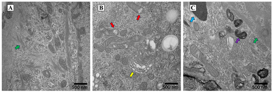 Characterization of HaCaT cell structure after high-irradiance blue or red light exposure using a Transmission Electron Microscope (TEM). The CTRL keratinocytes cells were poorly differentiated and contained tonofilaments (green arrow) (A). Blue light exposure had a negative impact on HaCaT cells: the yellow arrow points to an area with a dilated Golgi, while the red arrows identify the presence of damaged mitochondria (B). HaCaT cells exposed to red light showed a large amount of tonofilaments (green arrow) and increased lysosomal content (purple arrow). The cyan arrow points to a melanin granule. (C). Scale bars are reported in the figures.