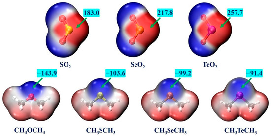 The MESP maps of the XO2 (X = S, Se, Te) and CH3YCH3 (Y = O, S, Se, Te) monomers. The red-colored region indicates the positive potential and the blue-colored region indicates the negative potential. The VS,max and VS,min values (in kJ/mol) denote the most positive potential and the most negative potential, respectively.
