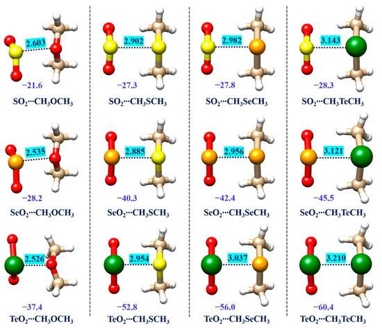 The optimized geometrical structures of the studied complexes. The chalcogen∙∙∙chalcogen distances are given in Å. The binding energies in kJ/mol are displayed using blue numbers.