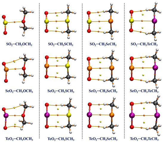 To sum up, the investigations on chalcogen∙∙∙chalcogen interactions so far mainly correspond to σ-hole interactions. However, reports on π-hole-type chalcogen∙∙∙chalcogen interactions are still very scarce [25,26,55,56]. In addition, as far as we know, no studies have been reported on such interactions containing the heavy chalcogen atom Te as a ChB donor or ChB acceptor. Herein, we used quantum chemical calculations to systematically investigate the strength and nature of the π-hole-type intermolecular chalcogen∙∙∙chalcogen interactions in the model complexes between XO2 (X = S, Se, Te) and CH3YCH3 (Y = O, S, Se, Te), which was frequently used as a nucleophile to engage in various NCIs like hydrogen bonds [57,58], chalcogen bonds [20,26], and pnictogen bonds [59]. Additionally, the molecular electrostatic surface potential (MESP) [60], quantum theory of atoms in molecules (QTAIM) [61], non-covalent interaction plot (NCIplot) [62], natural bond orbital (NBO) [63], and symmetry-adapted perturbation theory (SAPT) [64] analyses were also conducted to gain a deeper understanding of the π-hole-type chalcogen∙∙∙chalcogen interactions. Simultaneously, we have also compared the strength and nature of such interactions with those of the σ-hole-type chalcogen∙∙∙chalcogen interactions within the CH3YCH3∙∙∙CH3YZ (Y = S, Se, Te; Z = CH3, CN) complexes [42,43].