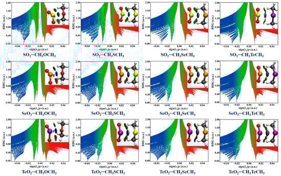 The intermolecular interactions between XO2 and CH3YCH3 were also characterized and visualized by performing the NCIplot analysis, which is based on the electron density and its derivatives. The NCIplot analysis results are graphically displayed in Figure 4, where the weak and strong attractive interactions are represented in green-colored and blue-colored regions, respectively, and the repulsive interactions correspond to the red-colored regions. One can see that one dark blue isofurface between the X atom and Y atom in each studied complex was found, indicating the existence of a strong attractive chalcogen∙∙∙chalcogen interaction. Additionally, two green(-blush) isosurfaces between the O and H atoms were also found in all the studied complexes, suggesting the presence of two weak attractive C−H∙∙∙O HBs. It should be noted that the attractive HBs in the XO2∙∙∙CH3OCH3 (X = S, Se, Te) complexes are the weakest among these HBs. Figure 4 also displays the scatter plots of the electronic reduced density gradient (RDG) vs. the sign(λ2)ρ for the twelve studied complexes. It is seen that the sign(λ2)ρ values associated with the X∙∙∙Y ChBs and the C−H∙∙∙O HBs are all negative, further confirming the presence of intermolecular attractive interactions. However, the sign(λ2)ρ values for the X∙∙∙Y ChBs are significantly more negative than those for the C−H∙∙∙O HBs, indicating the strengths of the X∙∙∙Y ChBs are obviously stronger than those of the C−H∙∙∙O HBs in all the studied complexes. Furthermore, it is worth mentioning that for the given ChB acceptor, the sign(λ2)ρ value becomes more negative upon going from the S to Te, demonstrating that the X∙∙∙Y ChBs are stronger in strength in the order of X = S < Se < Te. This matches very well with the MESP and QTAIM analysis results.