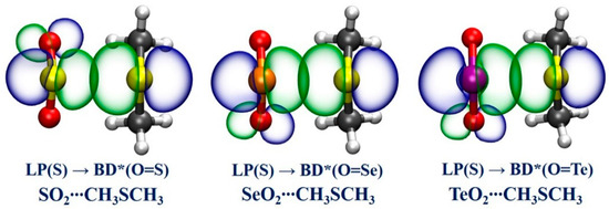 To further understand the nature of the X∙∙∙Y ChBs in terms of orbital interactions and the corresponding second-order perturbation energy (E(2)), which can qualitatively represent the strength of the X∙∙∙Y ChBs, NBO analysis has been implemented for the studied complexes. Table 3 summarizes the obtained E(2) values for orbital interactions associated with the X∙∙∙Y ChBs. The results disclose that the interactions between the lone pair (LP) of the Y atoms of CH3YCH3 and π*(O=X, X = S, Se, Te) antibonding orbital of XO2 are the largest contribution to the stabilization of these twelve complexes. One can note that the E(2) values for all the LP(Y)→π*(O=X) orbital interactions except for the LP(O)→π*(O=S) orbital interaction in the SO2∙∙∙CH3OCH3 complex are relatively large. Indeed, the X∙∙∙Y ChB is so strong that the NBO judges it to be a covalent bond in the SeO2∙∙∙CH3TeCH3, TeO2∙∙∙CH3SeCH3, and TeO2∙∙∙CH3TeCH3 complexes. In other words, the NBO considers these three complexes as one single molecular entity. For the same ChB donor, e.g., SO2, the E(2) value becomes larger as the Y atom becomes bigger in size. Similarly, for the same ChB acceptor, e.g., CH3OCH3, the E(2) value increases upon going from the S atom to the Te atom. The changing trend of the E(2) values is in qualitative accordance with that of the EB values and the NCIplot findings described above. In addition, Figure 5 also graphically displays the NBO analysis results for the three selected representative complexes. One can clearly see that there exists a large overlap between the LP orbital of the S atom of CH3SCH3 and the π*(O=X) antibonding orbital of XO2 (X = S, Se, Te), suggesting the existence of strong X∙∙∙S ChBs.