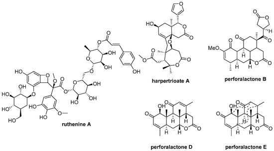 Chemical structures of ruthenine A, harpertrioate A, perforalactone B, perforalactones D and E.