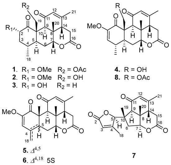 Seven undescribed quassinoids, perforalactones F-L (1–7), were isolated from the twigs of H. perforata plant using solvent partitioning and various types of chromatography techniques, including normal, reverse, and molecular-exclusion (Figure 2).