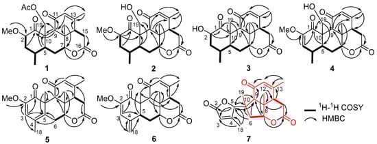 1H-1H COSY and key HMBC correlations of compounds 1–7.