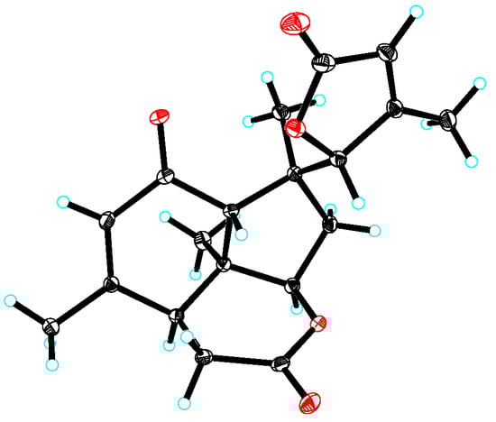 Perforalactone H (3) has a molecular formula of C20H26O5, which is 14 mass units less than that of perforalactone G (2), according to HRESIMS [m/z 347.1840 (M + H)+]. The NMR data of perforalactone H (3) are similar to those of perforalactone G (2) (Table 1, Figures S13 and S14), indicating their structural similarity. However, signals corresponding to tertiary methyl in the NMR spectra of perforalactone H (3) were observed, instead of the signals for hydroxymethyl at C-10 and O-bear methyl at C-2 in perforalactone G (2). This was further confirmed via 2D NMR experiments (Figures S15–S18), and its planar structure and relative configuration are shown in Figure 3 and Figure 4, respectively.
