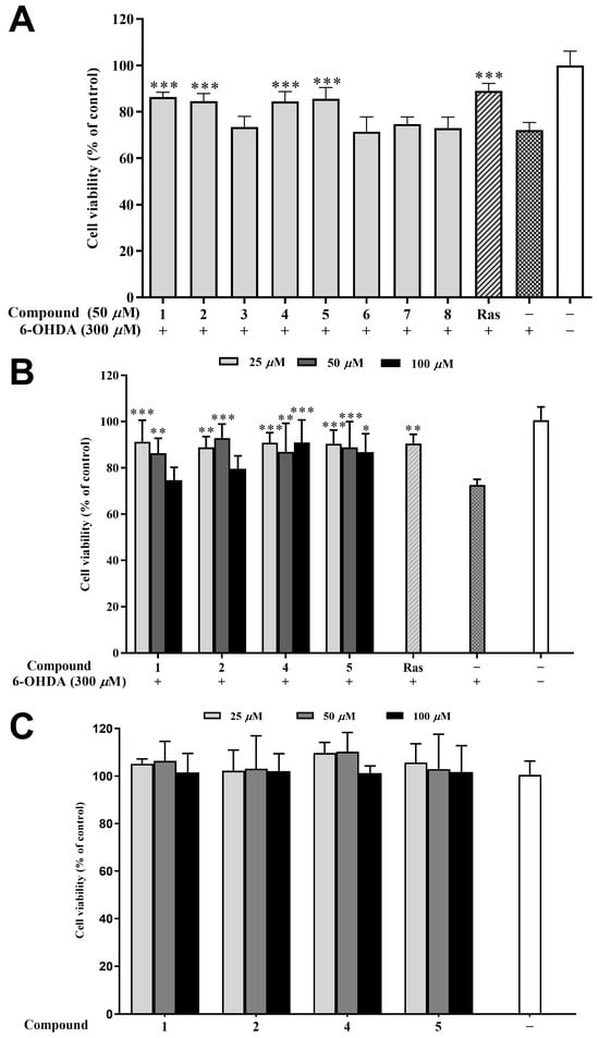 Neuroprotective effects of isolated compounds against 6-OHDA-induced injury in PC12 cells. (A) Neuroprotective effect of the isolated compounds at 50 μM. (B) Neuroprotective effect of compounds 1, 2, 4, and 5 at various concentrations (25, 50, and 100 μM). (C) Cytotoxic effect of compounds 1, 2, 4, and 5 (25, 50, and 100 μM) on the PC12 cell. Data were expressed as the means ± SD of three independent experiments. * p < 0.05, ** p < 0.01, and *** p < 0.001 compared with model cells in (A,B) and compared with control cells in (C). Rasagiline (Ras) was used as a positive control.