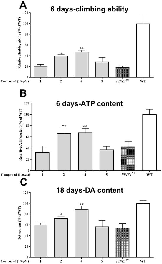Neuroprotective effect of the isolated compounds (1, 2, 4, and 5 at the concentration of 0.1% (v/v)) on PINK1B9 flies. (A) Climbing abilities of WT flies, PINK1B9, and PINK1B9 treated with isolated compounds at 6 days. (B) ATP levels of WT flies, PINK1B9, and PINK1B9 treated with isolated compounds at 6 days. (C) Dopamine levels of WT flies, PINK1B9, and PINK1B9 treated with isolated compounds at 18 days. Data from three times independent experiments were expressed as means ± SD, and * p < 0.05, and ** p < 0.01 compared with PINK1B9 flies.