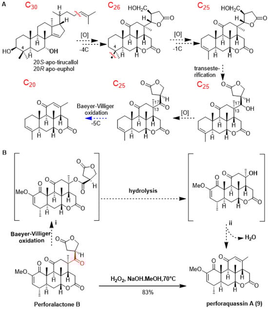 As shown in Scheme 1A, quassinoids are known to be derived from tetracyclic triterpene precursors through a series of oxidative degradation processes. To date, several biogenetic intermediates have been found suggesting how C30 triterpenoids are degraded to C20 quassinoids; however, no chemical transformation was accomplished [1]. Since C25 quassinoid perforalactone B structurally resembles the C20 quassinoids perforalactones F-L, along with the fact that both types of quassinoids coexist in H. perforata, we surmised that Baeyer–Villiger oxidation would be a straightforward gateway to the fission of the C-13/C-17 bond in perforalactone B [28]. After trying a number of reaction conditions, we found that perforalactone B in the presence of H2O2 and NaOH in MeOH at 70 °C overnight could be converted to a product with 83% yield (Table S2). The product displayed a peak at m/z 359 [M + H]+. Further analysis of its 13C NMR spectra (Table 2) revealed 21 signals, including 5 methyls (1 oxygenated), 2 methylenes, 6 methines (including 2 olefinic and 1 oxygenated), and 7 non-hydrogenated carbons (including 3 carbonyls and 2 olefinic). Its structure was identified to be a C20 quassinoid, perforaquassin A (9), by comparison of the NMR data with the literature [29]. On the basis of these results and the literature precedent, we propose a plausible route for this reaction, as shown in Scheme 1B. Perforalactone B could be further transformed to a key intermediate i via a mechanism similar to that of chemical Baeyer–Villiger oxidation. The insertion of an oxygen atom could occur between C-13 and C-17 because the fully substituted C-13 carbon has a migratory aptitude comparable to that of the γ-lactone group. The intermediate i would then undergo hydrolysis/dehydration to produce perforaquassin A (9). Thus, chemical transformation from perforalactone B to perforaquassin A (9) provides new insight into understanding the oxidative degradation pathway of quassinoids.