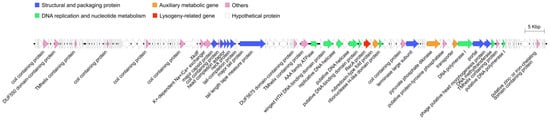 The phage R21Y genes were categorized into six main modules: structural and packaging proteins, DNA replication and nucleotide metabolism, auxiliary metabolic genes, lysogeny-related genes, other functions, and hypothetical proteins (Figure 2). The phage structural and packaging proteins cluster contained nine ORFs, eight of which encoded typical structural proteins, including the major capsid protein (MCP; ORF 58), head completion adaptor (ORF 60), neck protein (ORF 61), tail completion protein (ORF 62), major tail protein (ORF 63), tail length tape measure protein (ORF 65), portal protein (ORF 105), putative head morphogenesis protein (ORF 106), and a gene encoding the terminase large subunit (TerL, ORF 94) of the phage-packaging protein. Among the 39 functional genes, nine were related to DNA replication and nucleotide metabolism: the winged helix-turn-helix DNA-binding domain protein (ORF 76), replicative DNA helicase (ORF 78), DNA primase (ORF 80), putative DNA helicase (ORF 82), putative DNA-binding domain protein (ORF 83), ribonuclease H-like domain protein (ORF 88), DNA polymerase I (ORF 104), DNA methyltransferase (ORF 107), and putative DNA polymerase I (ORF 110). Three genes were identified as auxiliary metabolic genes (AMGs): rubredoxin-type fold protein (ORF 87), pyruvate phosphate dikinase (PPDK; ORF 99), and a transporter (ORF 103). The lysogeny-related gene was recombinase A (recA; ORF 85). Seventeen ORFs were involved in other functions, including coil-containing proteins (ORF 4, ORF 28, ORF 41, ORF 53, ORF 59, ORF 93, and ORF 98), transmembrane helix-containing proteins (ORF 15, ORF 74, and ORF 108), DUF550 domain-containing protein (ORF 7), XkdF (ORF 56), K+-dependent Na+/Ca+ exchanger (ORF 57), DUF5675 domain-containing protein (ORF 73), AAA family ATPase (ORF 75), putative protein-tyrosine phosphatase (ORF 101), and putative zinc- or iron-chelating domain-containing proteins (ORF 123). Eighty-seven ORFs were identified as hypothetical proteins. No tRNA, virulence, or resistance genes were detected in R21Y.
