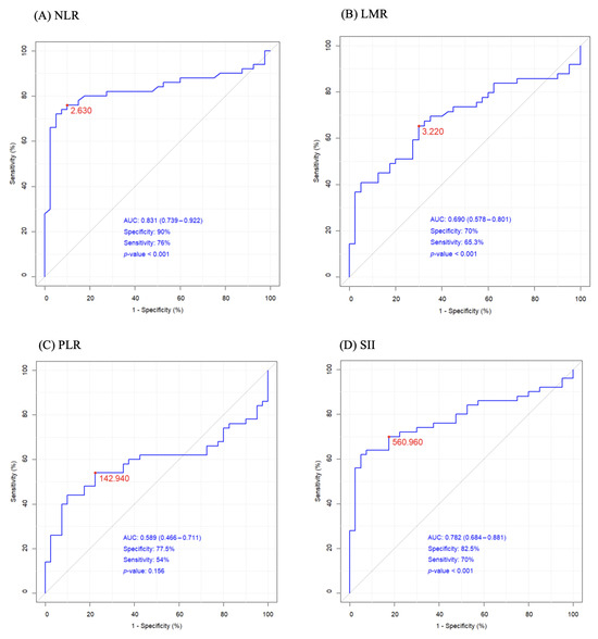 The ROC curves of (A) NLR neutrophil/lymphocyte ratio, (B) LMR lymphocyte/monocyte ratio, (C) PLR platelets/lymphocytes ratio, (D) SII systemic immune inflammation index.