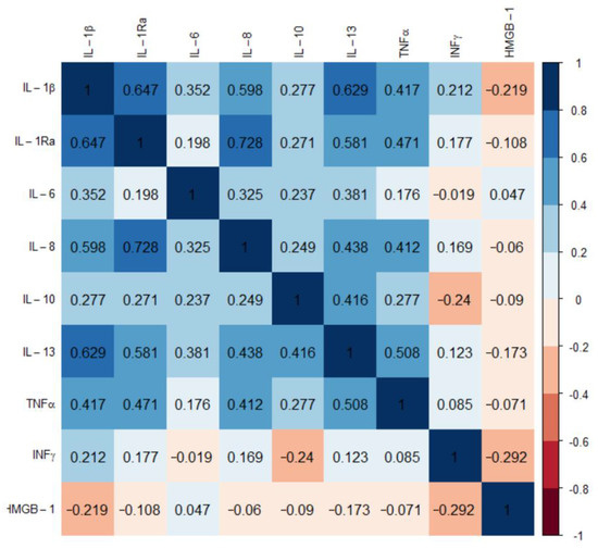 The most considerable changes were recorded for pro-inflammatory cytokines IL-1β, IL-6, and IL-8, which were approx. 1.5–2-fold higher, whereas TNFα and HMGB1 levels were lower in GBM than HC (p < 0.001). Spearman’s test demonstrated a correlation between IL-1β, IL-6, IL-8, IL-10, and TNFα, while HMGB1 was inversely related to IFNγ in patients with GBM (Figure 2).