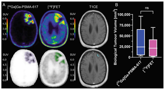 Volumetric comparison of biological tumour volume delineated on [68Ga]Ga-PSMA-617 and [18F]FET PET images. (A) Example of [68Ga]Ga-PSMA-617, [18F]FET PET and T1CE images of a patient (top), with biological tumour volume segmentations (bottom: purple for [68Ga]Ga-PSMA-617, green for [18F]FET and blue for T1CE); (B) box-and-whiskers plot of the comparison of [68Ga]Ga-PSMA-617 and [18F]FET biological tumour volume, with bar representing the median of the population. ns = no significant difference. PET: positron emission tomography. T1CE: T1-weighted contrast-enhanced. N = 10.