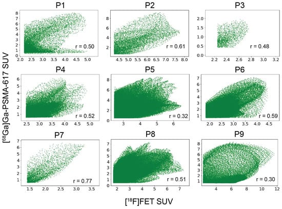 There was a positive correlation (Pearson coefficients r: 0.50, 0.61, 0.48, 0.52, 0.32, 0.59, 0.77, 0.51, 0.30; p < 0.0001) between voxel-wise [68Ga]Ga-PSMA-617 SUV values and [18F]FET SUV values within the overlapping volume between [68Ga]Ga-PSMA-617 BTV and [18F]FET BTV (Figure 2).