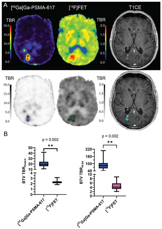 Results of the comparison of TBRmean and TBRmax in the BTV between [68Ga]Ga-PSMA-617 and [18F]FET are shown in Figure 3. The mean value of TBRmean was significantly higher for [68Ga]Ga-PSMA-617 than for [18F]FET (21.3 ± 8.4 vs. 2.3 ± 0.4; p = 0.002; Figure 3B). The mean value of TBRmax was significantly higher for [68Ga]Ga-PSMA-617 than for [18F]FET (90.8 ± 47.7 vs. 4.7 ± 2.2; p = 0.002; Figure 3B). Similarly to what can be observed in Figure 1, hotspots of [68Ga]Ga-PSMA-617 TBR did not entirely correspond to hotspots of [18F]FET TBR or T1-weighted contrast-enhancing (CE) tumour (Figure 3).