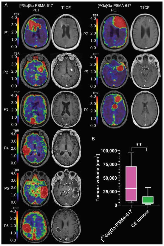 Comparison between [68Ga]Ga-PSMA-617 biological tumour volume and contrast-enhancing tumour volume. (A) [68Ga]Ga-PSMA-617 TBR and T1CE images; (B) box-and-whiskers plot of the volumetric comparison between [68Ga]Ga-PSMA-617 biological tumour and CE tumour, with bar representing the median of the population. ** = p < 0.01. CE: contrast-enhancing; PET: positron emission tomography. T1CE: T1-weighted contrast-enhanced. TBR: tumour-to-brain ratio. ns = no significant difference. N = 9.
