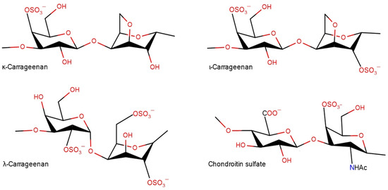 Amyloid fibrils isolated from living organisms are often found associated with glycosaminoglycans (GAGs) [25]—the sulfated polysaccharides of the mammalian extracellular matrix. In particular, they have been found in hepatic amyloid fibrils [26] and in Lewy bodies, a hallmark of some neurological diseases [27]. This implies the role of matrix polysaccharides as a platform for misfolded proteins’ assembly [23]. The GAG sulfation pattern is an important part of the “glycocode” that can undergo in situ remodeling, regulating the balance between healthy processes and diseases [28]. The exact role of the polysaccharide sulfation pattern in the regulation of amyloid structures is still to be unveiled. Some species of sulfated GAGs were shown to promote the formation of fibrillar structures by amyloid peptides in vitro [29,30,31]. Apparently, both the charge distribution and the carbohydrate backbone structure affect the fibril formation [32]. However, Takase at al. emphasized the importance of GAGs’ sulfation degree rather than their underlying structure in the fibrillation process [30]. Interestingly, sulfated polymers are also capable of facilitating fibril formation, but the resultant structure is rather amorphous [32]. The increasing sulfation and/or the decreasing degradation of heparan sulfate proteoglycans (HSPGs) and HS GAGs that occur in vivo due to the brain aging may lead to the formation of plaques and tangles in the AD brain, since the knockout of HS genes markedly reduces the accumulation of Aβ-fibrils in the brain. Furthermore, 6-O group sulfation and a specified length of GAG as a part of HSPGs are critical for the induction of amyloid formation [33]. On the other hand, some sulfated polysaccharides, the GAG-analogues, showed an inhibitory effect on amyloid fibril formation [24,34]. Furthermore, our recent report revealed that κ-carrageenan was able to disaggregate model amyloid fibrils and to restore the native secondary structure in a globular protein [22].