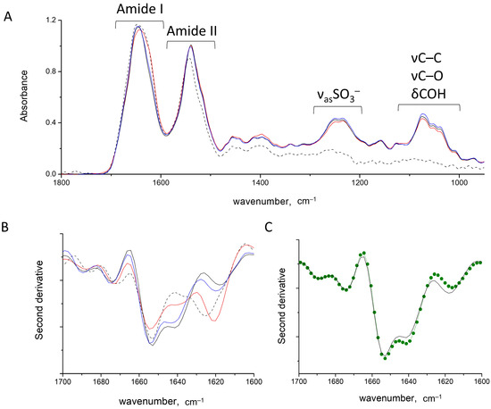 Previously, we have reported our attempts to disclose the atomistic organization in HEWL fibrils on the basis of accelerated MD simulations [46]. In the current work, we used FTIR spectroscopy to follow the perturbations in the structural organization of HEWL fibrils affected by carrageenans with different levels of sulfation. The correlation between the native-like secondary structure content and the disaggregation of HEWL fibrils at the meso-scale level was established in our previous publications using FTIR and AFM techniques, as well as CD spectroscopy [22]. The AFM images showed that long, unbranched fibrils of submicron length appeared for both the sediment and water-soluble fractions. Compared to the sizes of HEWL fibrils reported in the literature, the height of the fibrils in the sediment reached 6 nm, matching that of mature fibrils, while in the water-soluble fraction, their height was no more than ~4 nm, which is characteristic of protofibrils. The details of the secondary structure deduced from FTIR spectra revealed a relative increase in disordered elements in the water-soluble fraction, which did not affect the quality of amyloid parallel β-structures. Despite the increased fraction of disordered structures, the AFM shows that the integrity of the fibrils is not compromised. Water-soluble protofibrils were shown to be responsive for disaggregative polysaccharide action. In contrast, sediments were resistant to this action due to a tight lateral protofibril packing. In the current research, we use the water-soluble HEWL protofibrils to study the effect of complexation with polysaccharides of varying sulfation density and chain flexibility. Since the complexation of HEWL fibrils with anionic polysaccharides resulted in the formation of macroscopic gels, irrespectively to the stock solutions’ concentrations, the AFM usability for morphologic studies of these complexes at a monomolecular level was limited and, therefore, its usage was discarded. In contrast, FTIR spectroscopy has no limits in studying solid aggregates.