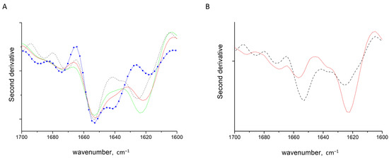 Second derivative spectra of HEWL fibrils (dashed line) and of their gel-like complexes with carrageenans at a polysaccharide-to-protein ratio of 0.3: (A) coiled κ- (blue line with symbols), ι- (red line) and λ- (green line) carrageenans, (B) κ-carrageenan in helical conformation (red line).