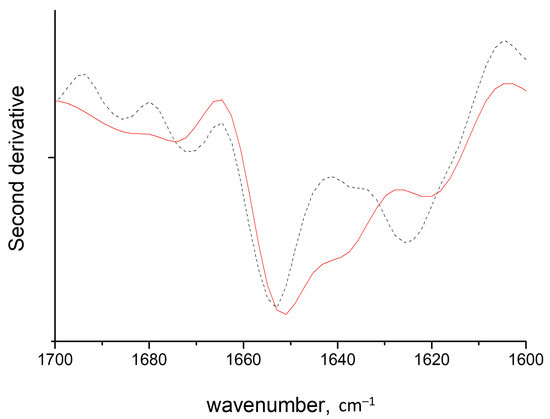 Second derivative spectra of HEWL fibrils (dashed line) and of their gel-like complexes with chondroitin-4-sulfate (red line) at a polysaccharide-to-protein ratio of 0.3.