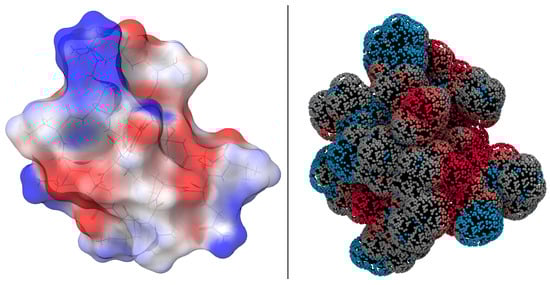 As can be seen from the ESP distribution in Figure 2 (left), most of the molecular surface has modest values ranging from to 30 kcal·mol. Positively charged regions (shown in blue) are predominantly located above and below the nine-amino-acid ring. Conversely, negatively charged regions (shown in red) are mainly located at the tail end.