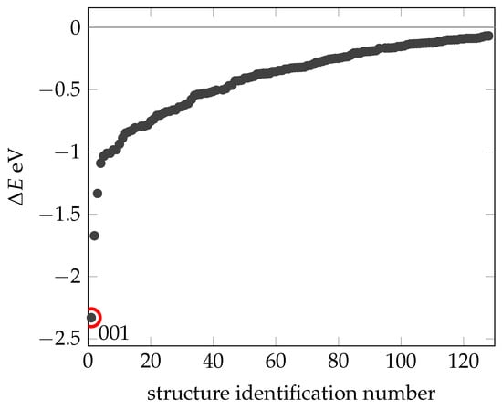 The calculated energies () for these different conformers are consolidated and plotted in Figure 3, all relative to the energy of N1 (). Using this method, we identified an additional 130 stable configurations (with lower energy) compared to the experimentally determined and geometrically optimized N1 conformation (Structures can be found in Supplementary Materials Listing S1)). The most stable of these configurations (with a total energy of eV referencing N1), designated as 001, stands out. Short molecular dynamics simulations were performed for the structures highlighted here, as well as for a selection of others, which resemble the N1 structure. It is important to note that only structures that show no changes at 300 K by our definition (RMSD more than 3 Å) are presented. Therefore, local minima where the energy barrier to structural change is overcome at 300 K are not included in this presentation.