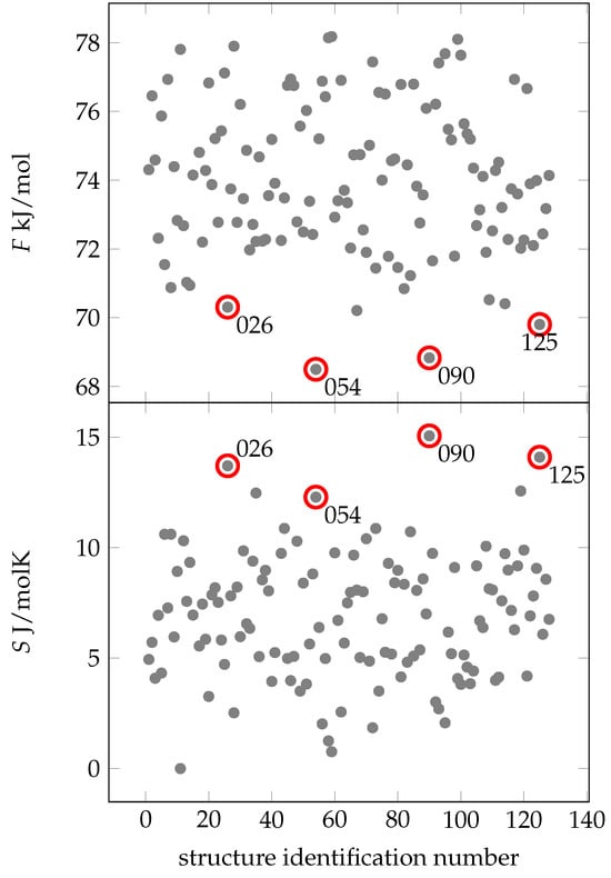 Free energies (gray dots) of different conformers of EPI-X4. All free energies are absolute values. In the lower figure are the entropic values (gray dots) relative to the lowest found entropy depicted. The conformers identified by lowest free energies (thus high entropy) are 026, 054, 090 and 125 (marked with a red circle). The x-axis shows the identification number of the structure.