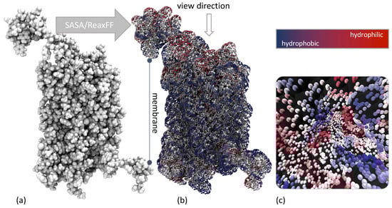 To link the calculations based on DFT to the force field, we took the surface area accessible to the solvent (SASA) and used ReaxFF to screen for interaction with relevant model groups, e.g., OH, NH and atomic oxygen and hydrogen. Here, the interaction means the preference of the site for an electrophilic or electrophobic species. First, the SASA was created by distributing a series of analysis points (23,500 points) along the van der Waals surface of the peptide. Then, at each point, the interaction of a probe atom with the particle was evaluated using ReaxFF single-point calculations. These points were then displayed with color coding according to their reactive interaction energies, providing a picture of the system regions of attractive or repulsive character.