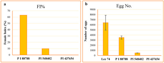 The resistance of the lines PI 88788, PI 437654, PI 548402, and Lee 74 were characterized to their level of resistance according to the scale proposed by Schmitt and Shannon 1992 [24] (Table 1). The average number of females on Lee 74 was 110.2, and the highest to the lowest female index (FI) value was 63.0, 10.0, and 0.0 on PI 88788, PI 548402, and PI 437654, respectively (Figure 1). However, despite high levels of SCN replication on PI 88788 following inoculation with SCN HG type 1.2.5.7, the egg production was significantly lower than that of Lee 74 (Figure 1). Considering these results, in this study we called PI 437654 an incompatible line, PI 548402 a semi-incompatible line, PI 88788 a semi-compatible line, and Lee 74 a compatible line.