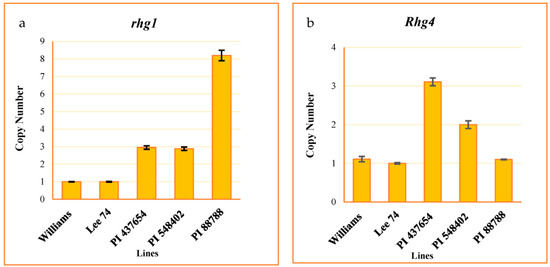 CNV of rhg1 ± SE (a) and Rhg4 ± SE (b). Williams used as a calibrator.
