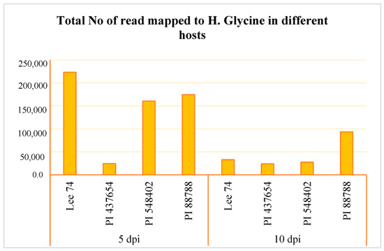 Total number of read mapped to H. glycines in four different hosts (e.g., Lee 74, PI 437654, PI 548402, and PI 88788) and at two time points (e.g., 5 and 10 dpi).