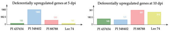 When examining differentially expressed genes (DEGs) within each genotype under infested and non-infested conditions, we identified that 167, 1966, 581, and 161 genes (DEGs) were upregulated (with cut-offs of log2 fold change ≥ 1, fragments per kilobase (kb) of transcript per million mapped reads (FPKM) ≥ 1, and p < 0.05) in PI 437654, PI 548402, PI 88788 and Lee 74, respectively, at 5 dpi (Figure 4). At 10 dpi, the number of DEGs significantly decreased in PI 437654, PI 548402, and PI 88788 but the number of DEGs remarkably increase in Lee 74 (Figure 4).