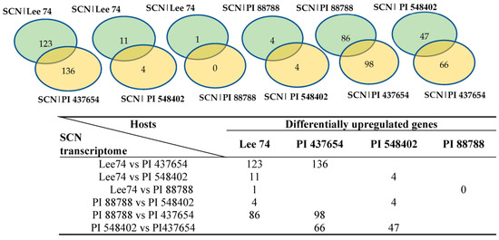 In order to study the expression of SCN pathogenicity genes during the infection process and assess the behaviour of SCN towards different hosts, we analyzed the transcriptomes of SCN HG type 1.2.5.7 at two time points in the four soybean PI lines. Comparison of the SCN transcriptomes across different soybean lines showed that the pathogenicity gene expression can be altered by the host plant. Furthermore, a two-by-two comparison of the host plants revealed that the SCN HG type 1.2.5.7 transcriptome in interaction with Lee 74 exhibited the largest number of differentially expressed genes compared with the transcriptome in PI 437654. In contrast, the transcriptome of SCN HG type 1.2.5.7 in interaction with Lee 74 had the highest similarity in gene expression profile with PI 88788 (Figure 6). For instance, the SCN transcriptome in Lee 74 had 123 differentially upregulated and 136 differentially downregulated genes when compared with its transcriptome in PI 437654, while only one gene was differentially upregulated in Lee 74 when compared with PI 88788 (Figure 6). This suggests that SCN adapts its gene expression profile in response to the host plant and that different soybean lines may have different levels of resistance against SCN.