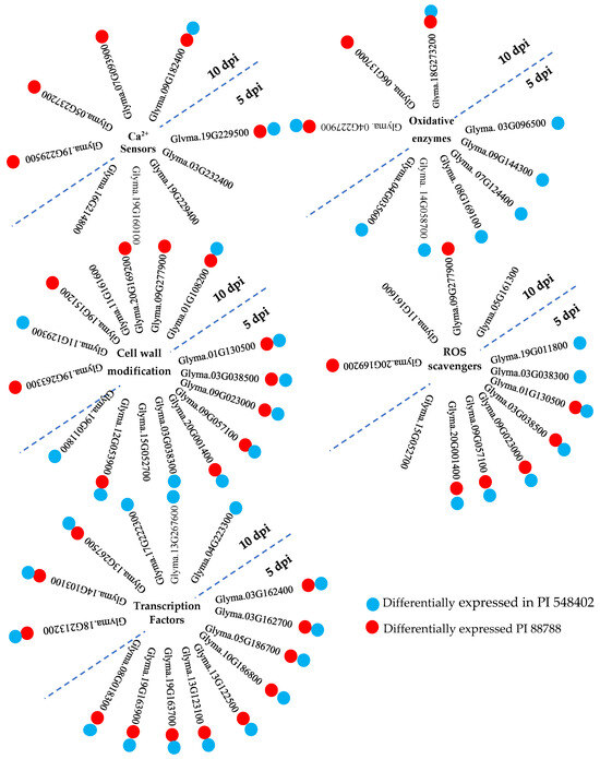 A summary of inter-genotype analyses of differentially expressed genes that were significantly upregulated in PI 437654 in response to SCN HG type 1.2.5.7 at 5 and 10 dpi and were not observed in Lee 74 as a susceptible line. Each cluster of genes is associated with specific functional categories involved in SCN-resistant defense mechanisms. Blue balls indicate SCN-responsive genes also expressed in PI 548402. Red balls indicate SCN-responsive genes also expressed in PI 88788.