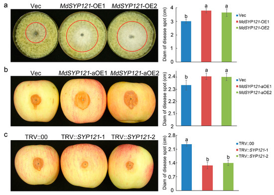 Phenotype and disease lesions of transgenic apple calli and transient transgenic apple fruit infected with B. dothidea: (a) phenotype and average diameters of lesions of Vec and MdSYP121-overexpressing transgenic apple calli infected with B. dothidea; (b) phenotype and average diameters of lesions of Vec apple fruit and apple fruit transiently overexpressing MdSYP121 infected with B. dothidea; (c) phenotype and average diameters of lesions of Vec apple fruit and apple fruit with transiently silenced MdSYP121 infected with B. dothidea. Error bars indicate the mean ± standard error of three independent experiments (n = 9). Different letters indicate significant differences (p < 0.01) based on Tukey’s HSD test.