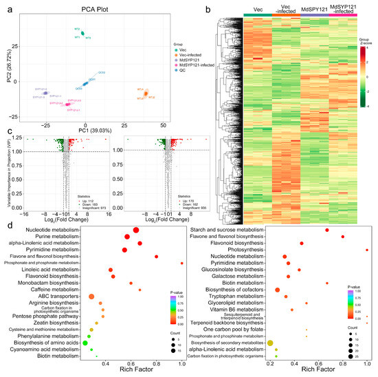 Differentially accumulated metabolites (DAMs) of Vec and MdSYP121-OE calli before and after B. dothidea inoculation. (a) PCA plots of metabolism identified by LC–MS/MS of Vec and MdSYP121-OE calli before and after B. dothidea inoculation. (b) Cluster analysis heatmap of Vec and MdSYP121-OE calli before and after B. dothidea inoculation. (c) Volcano plot analysis of Vec and MdSYP121-OE calli before and after B. dothidea inoculation. Left: Vec/MdSYP121. Right: Vec-infected/MdSYP121-infected. (d) KEGG functional analysis of Vec and MdSYP121-OE calli before and after B. dothidea inoculation. Left: Vec/MdSYP121. Right: Vec-infected/MdSYP121-infected.