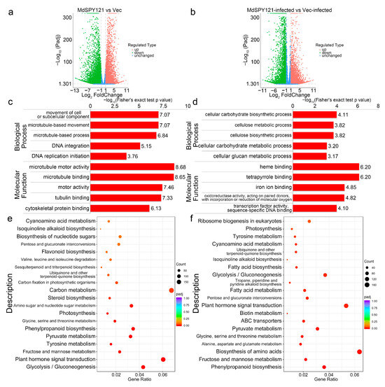 Differentially expressed genes (DEGs) of Vec and MdSYP121-OE calli before and after B. dothidea inoculation. (a) Volcano map of DEGs in Vec/MdSYP121. (b) Volcano map of DEGs in Vec-infected/MdSYP121-infected. (c) GO terms of DEGs in Vec/MdSYP121. (d) GO terms of DEGs in Vec-infected/MdSYP121-infected. (e) KEGG pathway analysis of DEGs in Vec/MdSYP121. (f) KEGG pathway analysis of DEGs in Vec-infected/MdSYP121-infected.