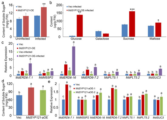 In addition, RT–qPCR was performed to measure the expression levels of genes related to starch and sucrose metabolism pathways in different calli. Six sugar transporter genes (MdERD6-7.1, MdMSSP2, MdERD6-16, MdERD6-7.2, MdERDPLT5.1, MdERDPLT5.2, and MdSUC3) were selected from the transcriptome dataset. The selected genes showed the same increasing expression profile and higher expression level in the MdSYP121-OE calli than in the Vec calli (Figure 4c). Furthermore, the expression levels of these genes were even higher in MdSYP121-OE calli after B. dothidea inoculation (Figure 4c). To further verify this result, the soluble sugar content and related gene expression in apple fruit transiently overexpressing MdSYP121 were measured before and after B. dothidea inoculation. The results suggested that the soluble sugar content was significantly higher than that in the control. The RT–qPCR results also showed that the expression levels of the sugar transporter genes MdERD6-7.1, MdERD6-16, MdERD6-7.2, MdERDPLT5.1, MdERDPLT5.2, and MdSUC3 were increased, while there was no significant change in the expression levels of MdMSSP2 in apple fruit transiently overexpressing MdSYP121 (Figure 4d,e).