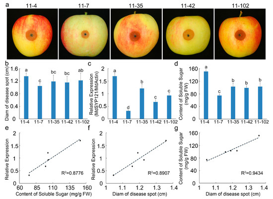 Phenotypes of apple in response to B. dothidea in the F1 population derived from a cross between ‘Golden Delicious’ and ‘Fuji Nagafu No. 2’. (a) Phenotypes of the fruit of five individual lines of apple (11-4, 11-7, 11-35, 11-42, and 11-102) after B. dothidea inoculation. (b) Diameter of disease spots on apple fruit of the five individual lines (11-4, 11-7, 11-35, 11-42, and 11-102) after B. dothidea inoculation; error bars indicate the mean ± standard error of three independent experiments (n = 6). Different letters indicate significant differences (p < 0.01) based on Tukey’s HSD test. (c) Relative expression of MdSYP121 in the apple fruit of the five individual lines (11-4, 11-7, 11-35, 11-42, and 11-102) after B. dothidea inoculation; error bars indicate the mean ± standard error of three independent experiments (n = 6). Different letters indicate significant differences (p < 0.01) based on Tukey’s HSD test. (d) The soluble sugar content in the apple fruit of the five individual lines (11-4, 11-7, 11-35, 11-42, 11-102) after B. dothidea inoculation; error bars indicate the mean ± standard error of three independent experiments (n = 6). Different letters indicate significant differences (p < 0.01) based on Tukey’s HSD test. (e) Correlation between MdSYP121 expression levels and soluble sugar content. (f) Correlation between MdSYP121 expression levels and disease spot diameter. (g) Correlation between soluble sugar content and disease spot diameter.