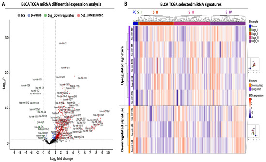 Differential expression analysis of miRNAs in TCGA-BLCA patient cohort. (A) Volcano plot analysis highlighting differentially expressed miRNAs (DEMs) between BLCA tumors (N = 409) and paracancerous tissues (N = 19). Green and red dots correspond to significantly down- and upregulated miRNAs, respectively. Vertical dashed lines indicate the log2FC thresholds (log2FC < −1 or > 1), while the horizontal dashed line highlights the statistical threshold (transformed − log10 p-value > 1.3, corresponding to p-value < 0.05). (B) Heatmap analysis highlighting the expression of the selected miRNAs in BLCA tumors. Tumors are stratified according to the pathological stage and are color-coded accordingly at the top horizontal annotation of the heatmap. The selected miRNAs are divided and color-coded as up- (purple) or downregulated (orange), as indicated in the left-row annotation. Box plots, shown on the right, illustrate the expression of up- or downregulated miRNAs in all tumor stages against that of miRNAs in paracancerous (normal) biopsies, the average expression of which is highlighted with the vertical dashed line inside the box plot. Heatmap colors correspond to Z-scores of normalized miRNA expression.