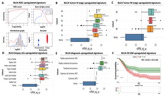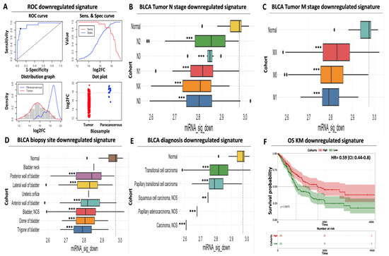 Diagnostic and prognostic significance of the upregulated miRNA signature. (A) ROC analysis for discriminating BLCA tumor vs. paracancerous tissues. ROC curve (upper left) indicates an increased diagnostic potential (AUC = 0.95) of the upregulated miRNA signature shown in red. The cutoff analysis curve (upper right) indicates the optimal expression cutoff point (10.26) for separating tumors from paracancerous biopsies. The bottom left distribution graph highlights the expression range of the miRNAs that constitute the upregulated signature in paracancerous (red) or tumor (blue) samples. Finally, the bottom right dot plot highlights the average expression of the upregulated miRNA signature in individual paracancerous (blue) or tumor (red) biopsies. The horizontal dashed line indicates the calculated optimal cutoff point. (B) Box plot analysis indicating the elevated expression of the upregulated miRNA signature according to regional lymph node status of AJCC tumor invasion compared to paracancerous levels. (C) Same as in (B) but for AJCC distant metastasis status. (D) Box plot analysis highlighting the elevated expression of the upregulated miRNA signature in various anatomical/histological sites of BLCA biopsies within the bladder. (E) Box plot analysis depicting the elevated levels of the upregulated signature in common histological variants of BLCA. The vertical dashed line in all box plots marks average miRNA expression in paracancerous samples. (F) Kaplan–Meier analysis showing a statistically significant association between elevated expression of the upregulated miRNA signature (red curve) and shorter overall survival time of BLCA patients. Dashed lines indicate duration for 50% probability of survival since diagnosis. Asterisks in all graphs indicate the level of statistical significance based on ANOVA (***: p-value < 0.001, **: p-value < 0.01).