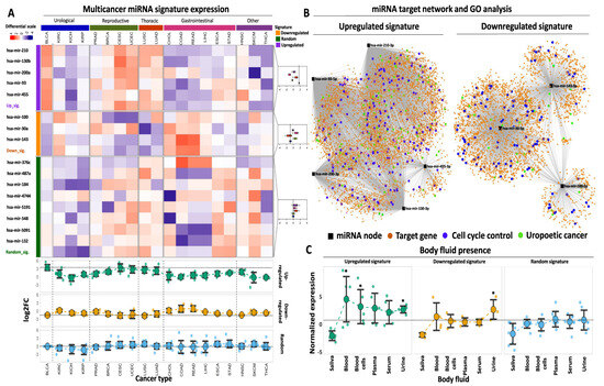 Multicancer and body fluid expression analysis of the miRNA signatures. (A) Heatmap illustrating the expression of the up- and downregulated miRNAs in 19 cancer types from TCGA against a randomly selected miRNA signature of equal size. Tumor types are broadly annotated at the top of the heatmap according to their anatomical primary sites. The selected miRNAs are divided and color-coded as upregulated (purple), downregulated (orange), or randomly expressed (green). as indicated in the left-row annotation. Box plots, shown on the right, indicate the expression of up-, downregulated, or randomly expressed miRNAs in different primaries, the mean expression of which is highlighted with the vertical dashed line inside the box plot. Heatmap colors correspond to Z-scores of normalized miRNA expression. The bottom dot plots indicate average log2FC levels of each signature (upregulated, downregulated, or random) across the 19 analyzed cancer types. Horizontal dashed lines indicate the average expression of each signature in BLCA. An explanation of tumor type abbreviations is available at https://gdc.cancer.gov/resources-tcga-users/tcga-code-tables/tcga-study-abbreviations (accessed on 1 October 2023)). (B) miRNA target network and GO analysis for both miRNA signatures. Black square nodes correspond to the five miRNAs that constitute the upregulated signature (shown on the left) or the three miRNAs that constitute the downregulated signature (shown on the right). Predicted mRNA targets are shown with the orange circle nodes and are connected with their respective miRNA regulator(s) with gray edges. Blue circles highlight mRNA target genes that are involved in cell cycle regulation, while green circles highlight target genes that are associated with BLCA or genitourinary neoplasms in general. (C) Dot plots demonstrating average normalized expression of the up-, downregulated, or random miRNA signatures in various body fluids. Data represent mean ± S.E. The dashed horizontal line highlights the mean expression of the random miRNA signature in urine. Asterisks highlight statistical significance compared to the random miRNA signature (*: p-value < 0.05).