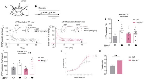 The magnitude of hippocampal LTP is maintained in Mecp2+/− female mice, but BDNF loses the facilitatory effect upon LTP in Mecp2+/− female animals: (A) Schematic representation of a transverse hippocampal slice and the recording configuration used in the present study. (B) Schematic representation of the experimental protocol used to induce LTP and to test the effect of BDNF at a concentration of 20 ng/mL (for a detailed description, see Section 4.2). Panels (C,D) represent the time course of averaged fEPSP slopes induced after θ-burst stimulations in hippocampal slices isolated from WT (grey symbols, n = 6) or Mecp2+/− (pink symbols, n = 8) mice, either in the absence (dark-filled circles bellow the bar, light bars) or in the presence (white-filled circles bellow the bar, dark bars) of BDNF. Recording traces from representative experiments are shown for WT (black trace-basal synaptic potential (1,3); gray trace-synaptic potential after LTP (2,4)) and Mecp2+/− (pink) animals on top of each graph (1 and 3—baseline; 2 and 4—LTP, 1 h after the θ-burst). The arrow indicates LTP induction. In (E), the histogram shows the magnitude of LTP in the absence (dark—LTP S1) and the presence of BDNF (20 ng/mL, light bars—LTP S2) obtained in hippocampal slices from WT (gray) or Mecp2+/− (pink) animals; the PTP magnitude is shown in (F). Panels (G,H) show the input/output (I/O) curves and the respective means of the top parameter corresponding to responses generated by various stimulation intensities (60–340 μA) in WT (gray circles, n = 8) and Mecp2+/− (pink circles, n = 8) mice hippocampal slices. * p < 0.05; ** p < 0.01 (paired Student’s t-test) as compared with the absence of BDNF in the same experiments.