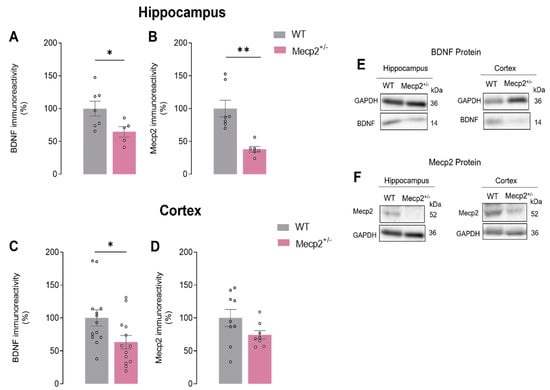 BDNF and Mecp2 protein levels in Mecp2+/− animals: In (A,C), the averaged BDNF density levels are shown (WThip, n = 7; WTctx, n = 13; Mecp2+/−hip, n = 5; Mecp2+/−ctx, n = 13), while (B,D) show Mecp2 (WThip, n = 7; WTctx, n = 9; Mecp2+/−hip, n = 6; Mecp2+/−ctx, n = 8) density levels evaluated by Western blot analysis in hippocampal and cortical homogenates from WT (gray) and Mecp2+/− (pink) animals at 26–30 weeks of age. (E,F) show the representative bands obtained. Immunoreactivity against GAPDH was used for normalization purposes. All values are mean ± standard error of mean (SEM). * p < 0.05; ** p < 0.01 (unpaired Student’s t-test) against WT values. Each circle represents one independent n.