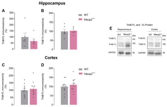 TrkB-FL and TrkB-Tc protein levels in heterozygous Mecp2+/− female mice: In (A,C), averages of TrkB-FL levels density are shown (WThip, n = 6; WTctx, n = 11; Mecp2+/−hip, n = 6; Mecp2+/−ctx, n = 11). In (B,D), TrkB-Tc (WThip, n = 6; WTctx, n = 10; Mecp2+/−hip, n = 5; Mecp2+/−ctx, n = 11) levels are shown by Western blot analysis in hippocampal and cortical homogenates from WT (gray) and Mecp2+/− (pink) animals at 26–30 weeks old. Representative immunoblots are shown in (E). Immunoreactivity against GAPDH was used for normalization purposes. All values are mean ± SEM. Unpaired Student’s t-test against WT values. Each circle represents one independent n.