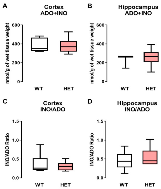 Adenosine (ADO) plus inosine (INO) content in the cortex and hippocampus of WT and heterozygous Mecp2+/− female mice: Panels (A,B) represent the amount of ADO+INO in nmol/g of wet tissue weight detected by HPLC/DAD from extracts of the cortex and hippocampus, respectively, of wild-type (WT, gray bars) and Mecp2+/− (HET, pink bars) female mice. Panels (C,D) represent the adenosine deaminase (ADA) activity given by the INO/ADO ratio in extracts of the cortex and hippocampus, respectively, of WT (gray bars) and Mecp2+/− (HET, pink bars) female mice. Box-and-whiskers plots are represented with whiskers ranging from minimum to maximum values; the horizontal lines inside boxes indicate the corresponding medians. Each data set represents five to eight individuals (see text for details); duplicate measurements were performed for each individual experiment.. Typical chromatograms obtained using these experimental settings are shown in Supplementary Figure S1.