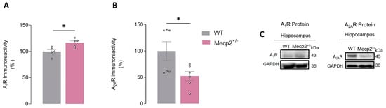 In summary, when comparing Mecp2+/− to WT females, we observed (1) a significant increase in A1R protein levels in Mecp2+/− females (HIPWT = 100.00 ± 3.89%, n = 5 vs. HIPMecp2+/− = 116.60 ± 3.62%, n = 5, p = 0.01, unpaired Student’s t-test; Figure 5A,C) and (2) a significant decrease (~47%) in the levels of A2AR protein in Mecp2+/− (HIPWT = 100.00 ± 17.78%, n = 6 vs. HIPMecp2+/− = 52.47 ± 8.54%, n = 6, p = 0.04, unpaired Student’s t-test; Figure 5B,C).