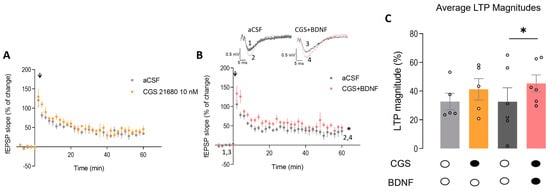 LTP induction and quantification: After functional and energetic recovery, slices were transferred to the recording chamber for submerged slices, being continuously superfused with bathing solution (Krebs’ solution) gassed with 95% O2 and 5% CO2 at 32 °C. The flux of bathing solution was established at 3 mL/min and the drugs used were added to this superfusion solution. Recordings were obtained with an Axoclamp 2B amplifier and digitized (Axon Instruments, Foster City, CA, USA). Individual responses were monitored, and averages of eight consecutive responses were continuously stored on a personal computer with the LTP program [52]. Field excitatory postsynaptic potentials (fEPSPs) were recorded through an extracellular microelectrode (2–8 MW resistance, Harvard apparatus LTD, Fircroft way, Edenbridge, Kent) placed in the stratum radiatum of the CA1 area. Stimulation (rectangular 0.1 ms pulses, once every 10 s) was delivered through a concentric electrode placed on the Schaffer collateral–commissural fibers in the stratum radiatum near CA3-CA1 border. The stimulus intensity (80–260 µA) was initially adjusted to obtain a large fEPSP with a minimum population spike contamination. Stimulation was delivered alternatively to two independent pathways (previously tested by paired pulsed facilitation protocol). LTP was induced by a θ-burst protocol consisting of three trains of 100 Hz, three stimuli, separated by 200 ms, as previously described [19]. LTP was quantified as the % change in the average slope of the fEPSP taken 50 to 60 min after LTP induction in relation to the average slope of the fEPSP, measured during the 10 min that preceded the induction of LTP. In each individual experiment, the same LTP-inducing paradigm was delivered to each pathway. At 1 h after LTP induction, in one of the pathways (S1—Figure 1B), BDNF (20 ng/mL), CGS21680 (10 nM), or both were added to the superfusion solution, and LTP was induced in the second pathway (S2—Figure 1B) no less than 15 min after the drug perfusion and only after stability of fEPSP slope values was observed for at least 10 min. The effect of the drug tested upon LTP was evaluated by comparing the magnitude of LTP in the first pathway in the absence of BDNF (control pathway) with the magnitude of LTP in the second pathway in the presence of the drug (test pathway); each pathway was used as control or test on alternate days [15].